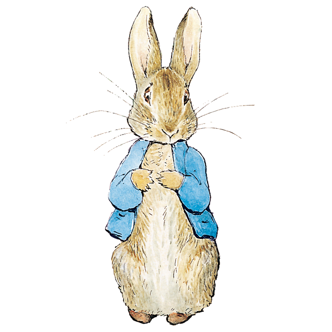ピーターは、ビアトリクス・ポターの作品の中で最も良く知られたキャラクターです。たいへんないたずらっこのピーターは、お母さんに「マグレガーおじさんの畑には行かないように」と注意されますが、いいつけを守らず畑にしのびこみ、マグレガーおじさんに見つかってしまいます。1902年に出版された『ピーターラビットのおはなし』は、ビアトリクス・ポターの最初の本で、これは彼女が友人の息子である病床のノエル少年に送った絵手紙がもとになっています。