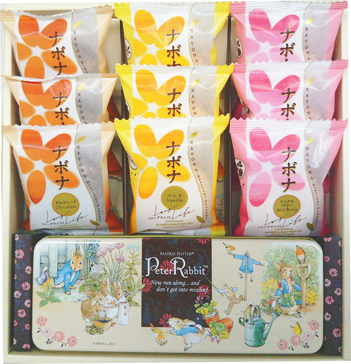 手土産の大定番・ナボナロングライフ(三種類)と、ピーターラビットのイラストが可愛い缶入りのママンミールが一緒になっていて、何から食べようか、会話にも花が咲きそうですね。