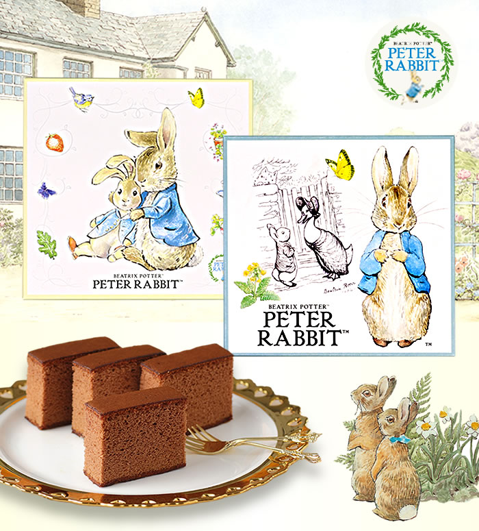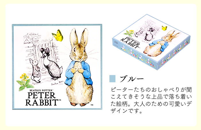 ぬいぐるみを抱きしめている幼いピーターラビットと、上品で落ち着いた絵柄の中にもどこか可愛らしさが溢れた2つのデザイン。