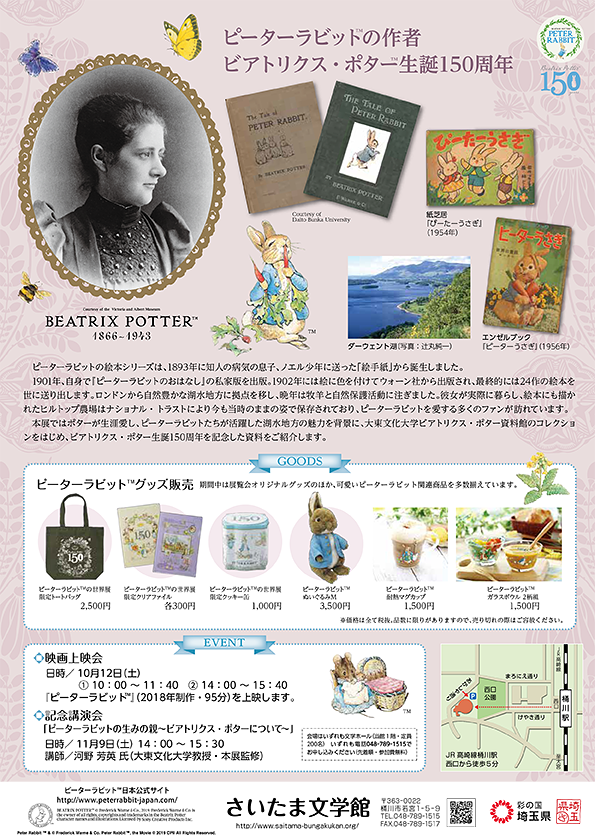展覧会オリジナルグッズやピーターラビットグッズの販売はもちろん、映画『ピーターラビット™』(2018年制作・95分)を上映するほか、大東文化大学教授 河野芳英先生による記念講演会も開催されます。(要お申し込み)