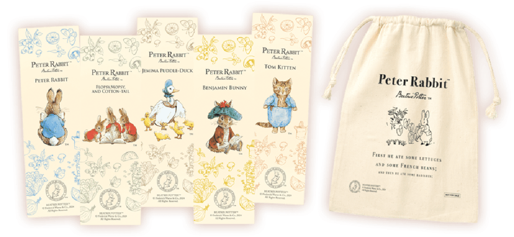 会期中、「ピーターラビット™ イロドリマーケット」の会場にて1回税込3,000円以上お買いあげの各日先着50名様に「オリジナルクリアしおり(日替り・5種)」を1枚、さらに税込5,000円以上お買いあげの各日先着50名様に「オリジナル巾着」を1点プレゼント