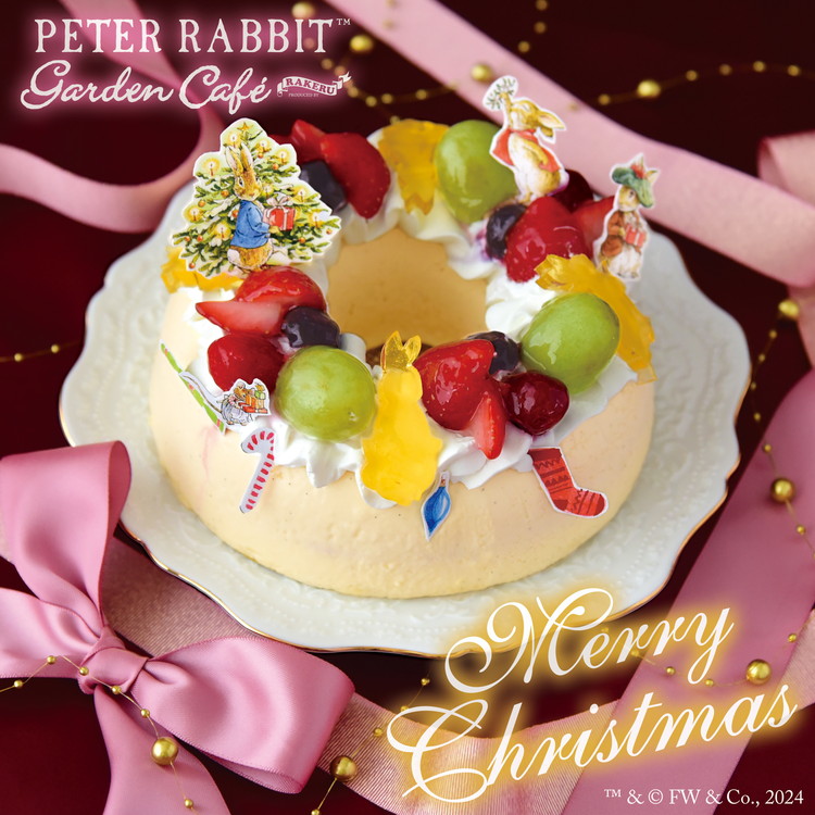 ピーターラビットのシルエットとカラフルなフルーツをあしらったリースのようなクリスマスケーキ。