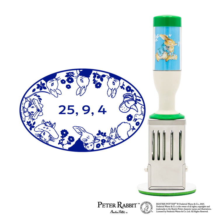 ピーターラビットのかわいいキャラクターたちがデザインされた小判型の日付印です。