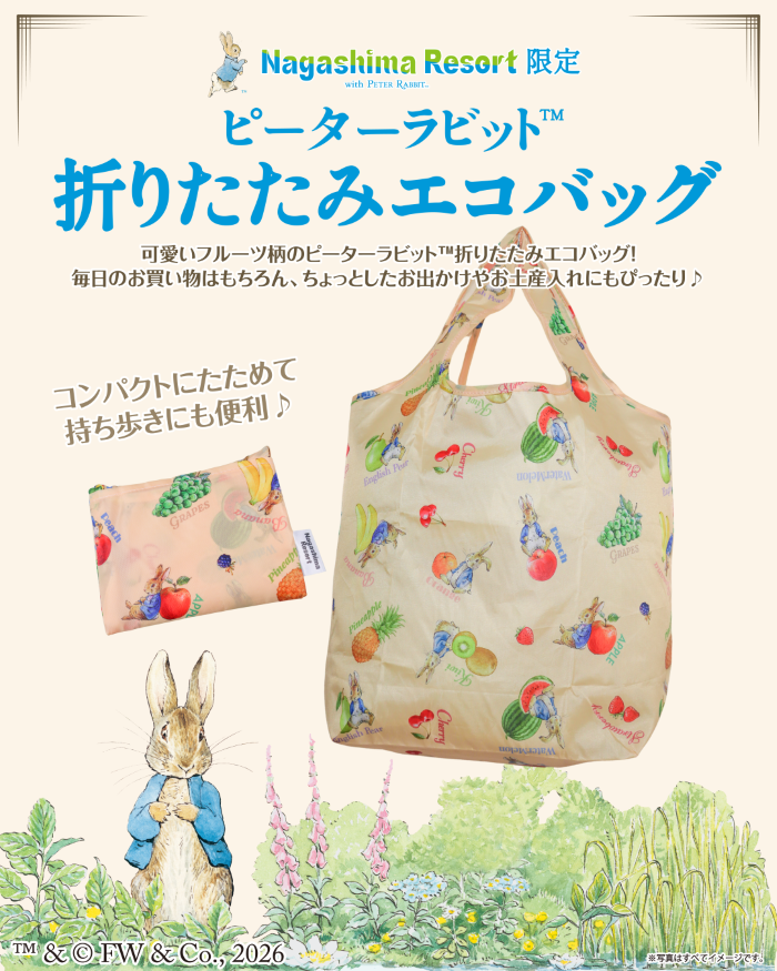 ナガシマリゾート限定デザイン!可愛いフルーツ柄のピーターラビット™折りたたみエコバッグが登場!