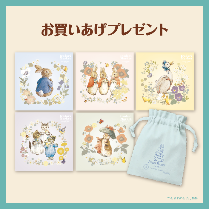 会期中、会場にて一勘定税込3,000円以上お買いあげの各日先着100名さまに「オリジナルスクエアポストカード」を1枚、さらに税込5,000円以上お買いあげの各日先着50名さまに「オリジナル巾着」を1点プレゼント。
