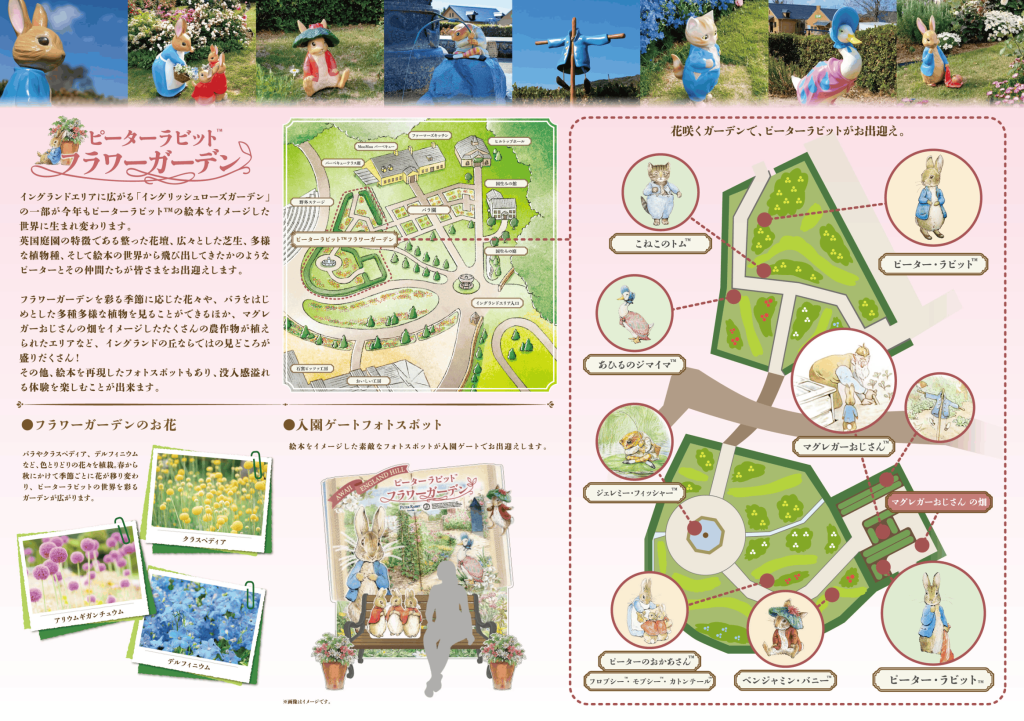 ピーターラビットたちのフォトスポットやマグレガーおじさんの畑、立像などいつもと違う「イングリッシュローズガーデン」エリアをお楽しみいただけます。