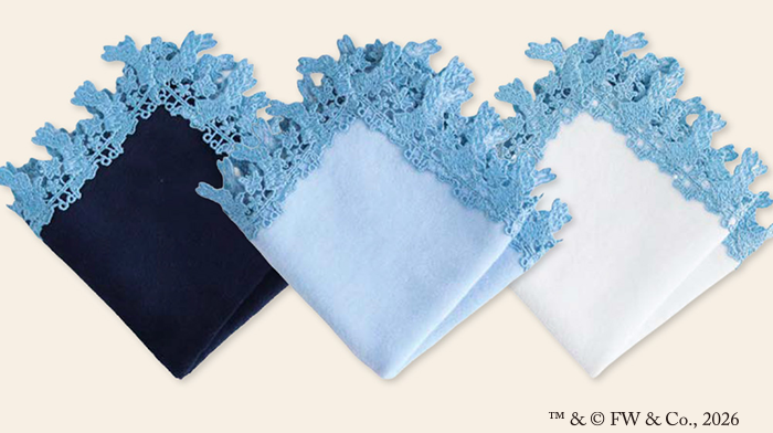 蝶を追いかけるピーターラビット™や小さな花まで、ブルーのレースで可憐に表現されています。
